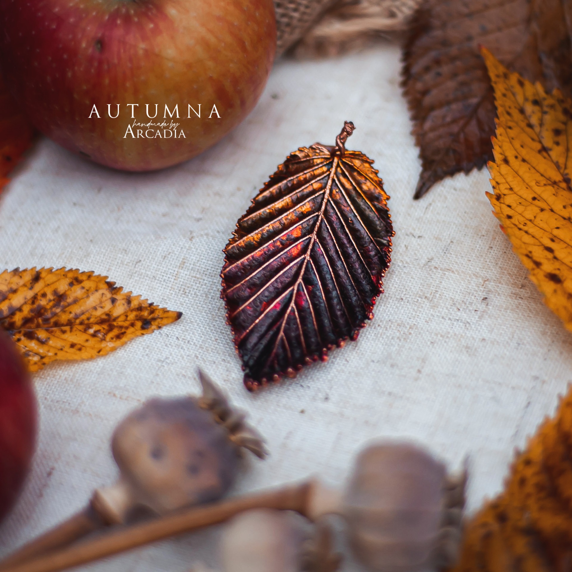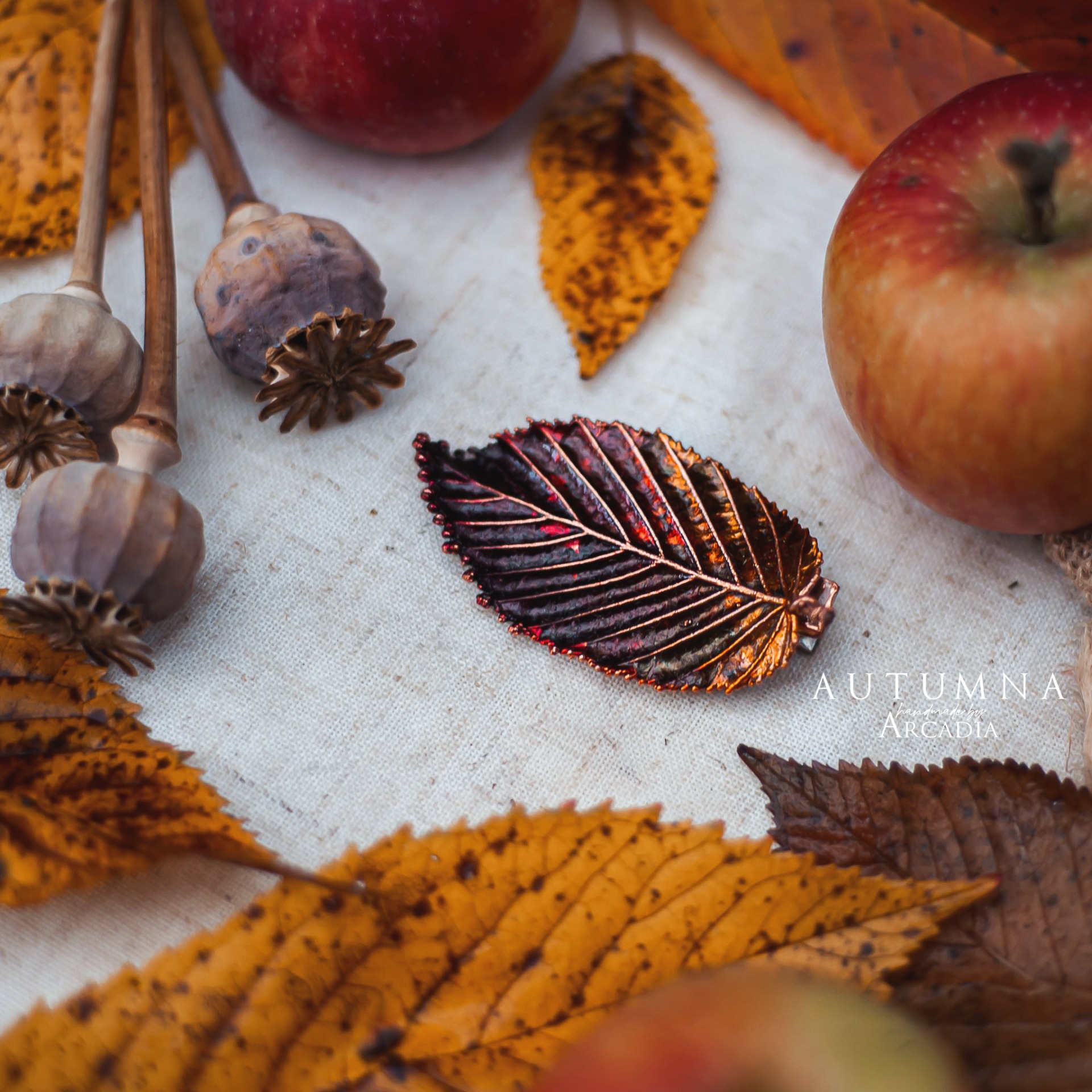 Spona do vlasů ze skutečného pokoveného lístku habru v ohnivých podzimních tónech. Vyrobeno rukama a srdcem v alchymistické dílně na severu Čech.