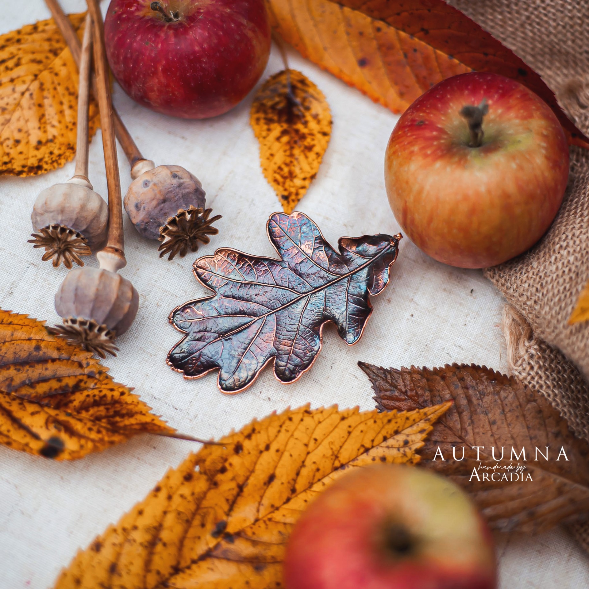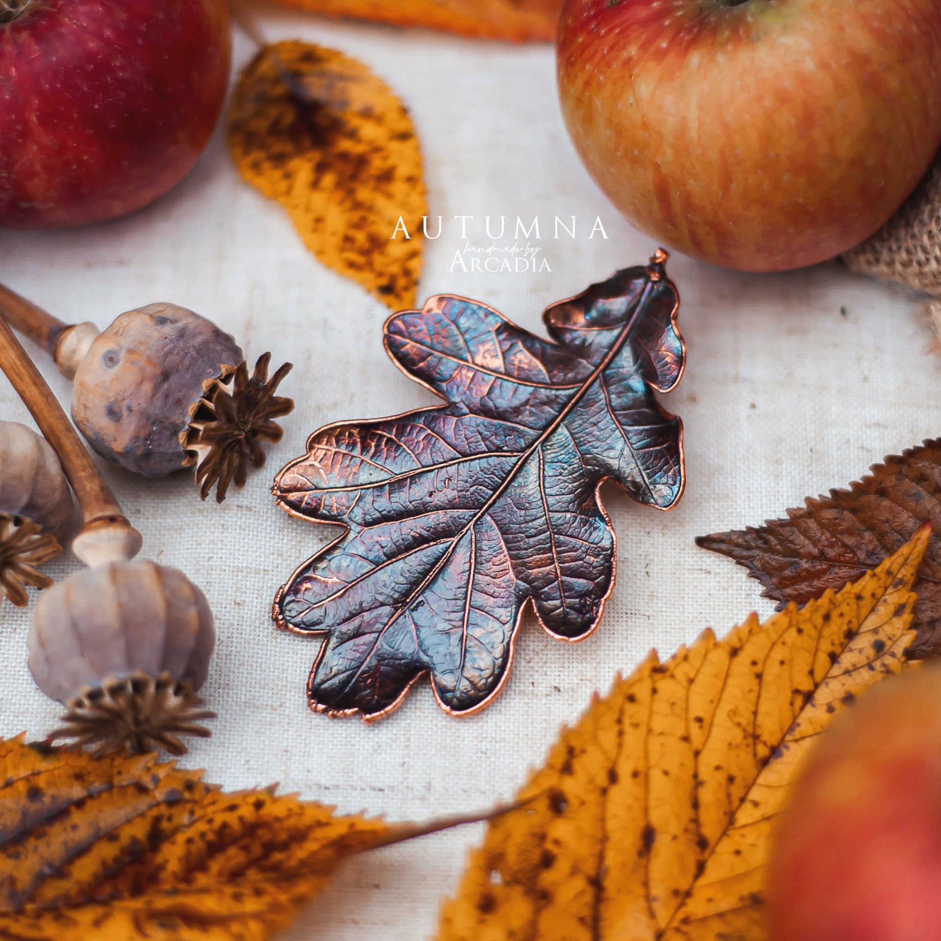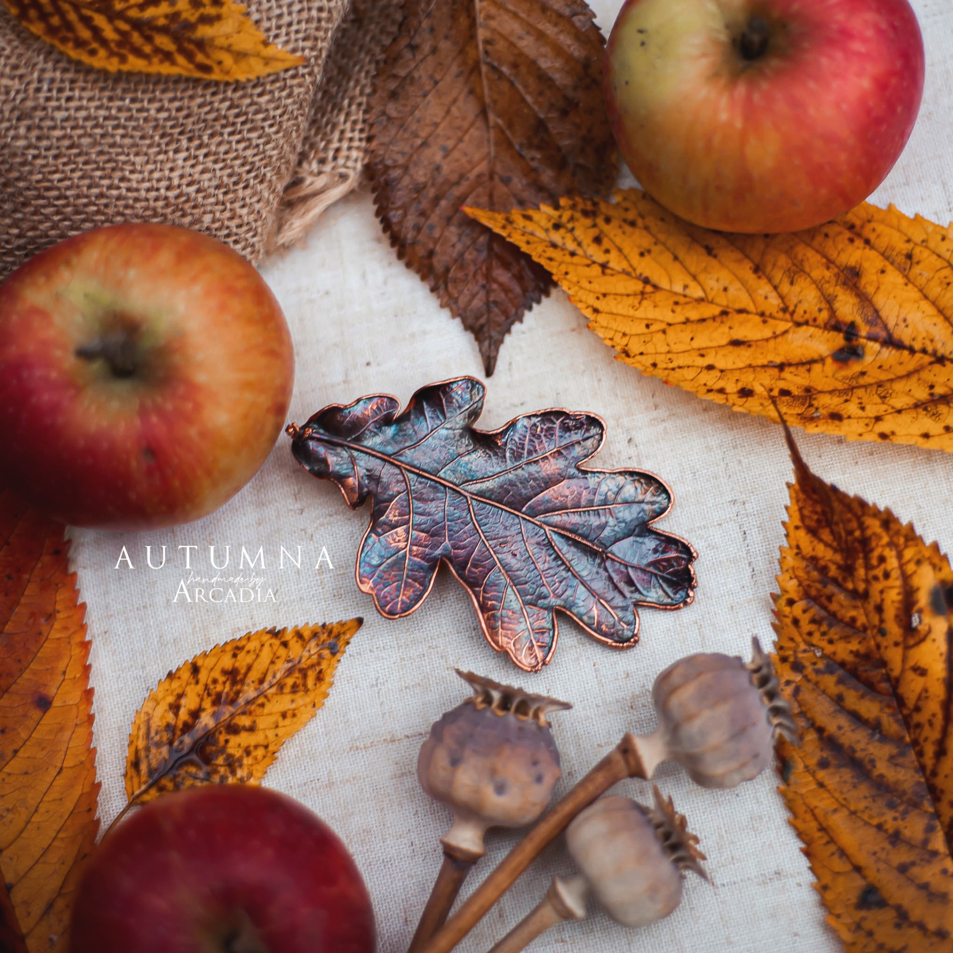 Spona do vlasů ze skutečného pokoveného lístku dubu v olejově duhové patině. Vyrobeno rukama a srdcem v alchymistické dílně na severu Čech.