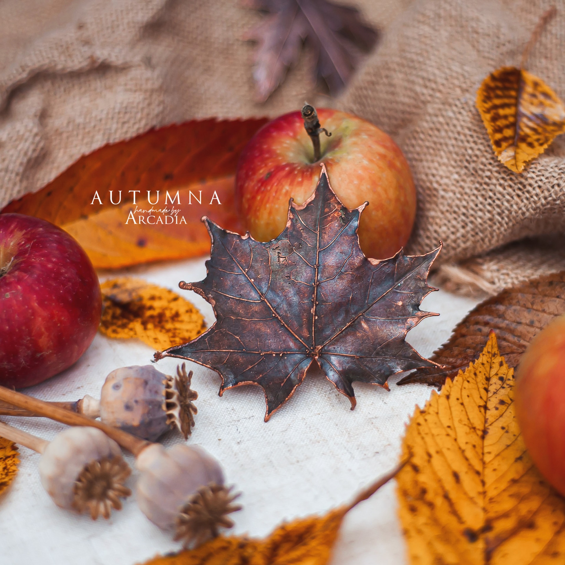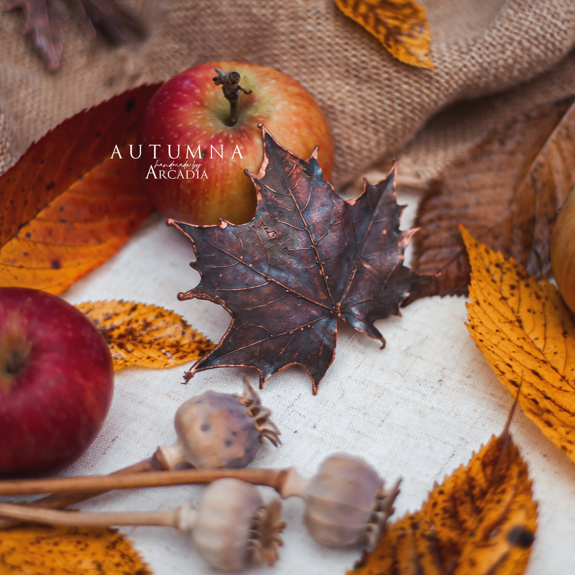 Spona do vlasů ze skutečného pokoveného lístku javoru v olejově duhové patině. Vyrobeno rukama a srdcem v alchymistické dílně na severu Čech.