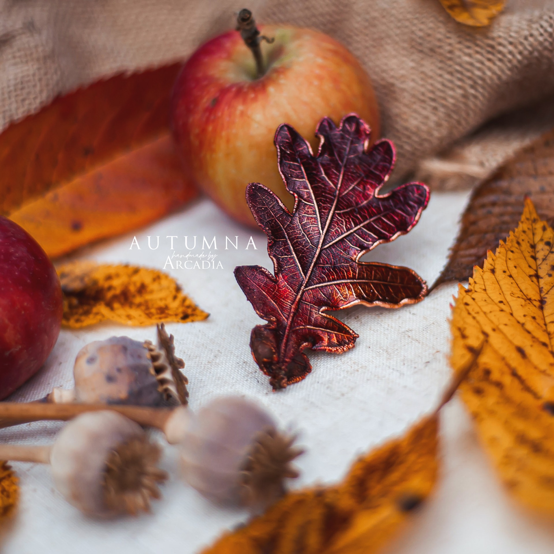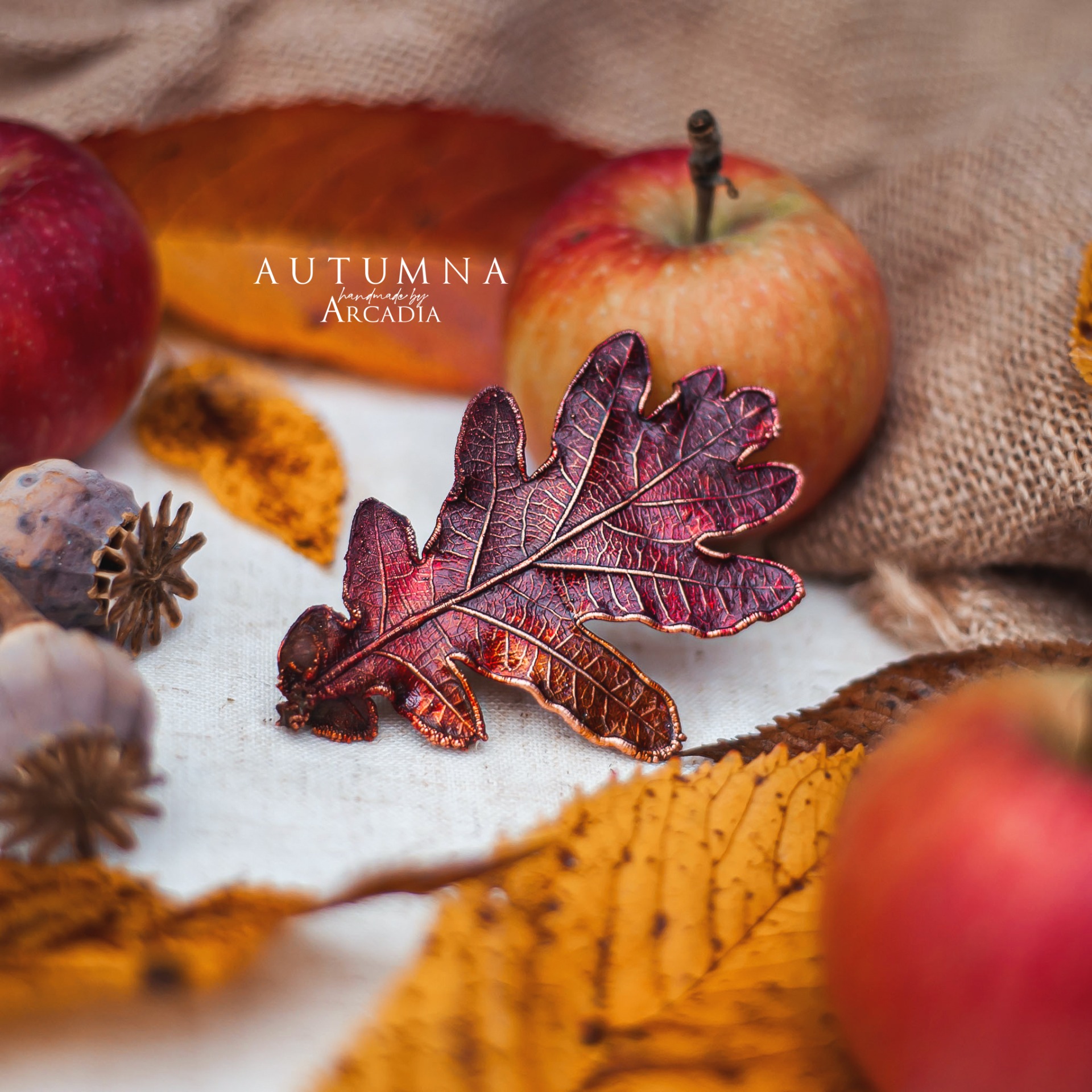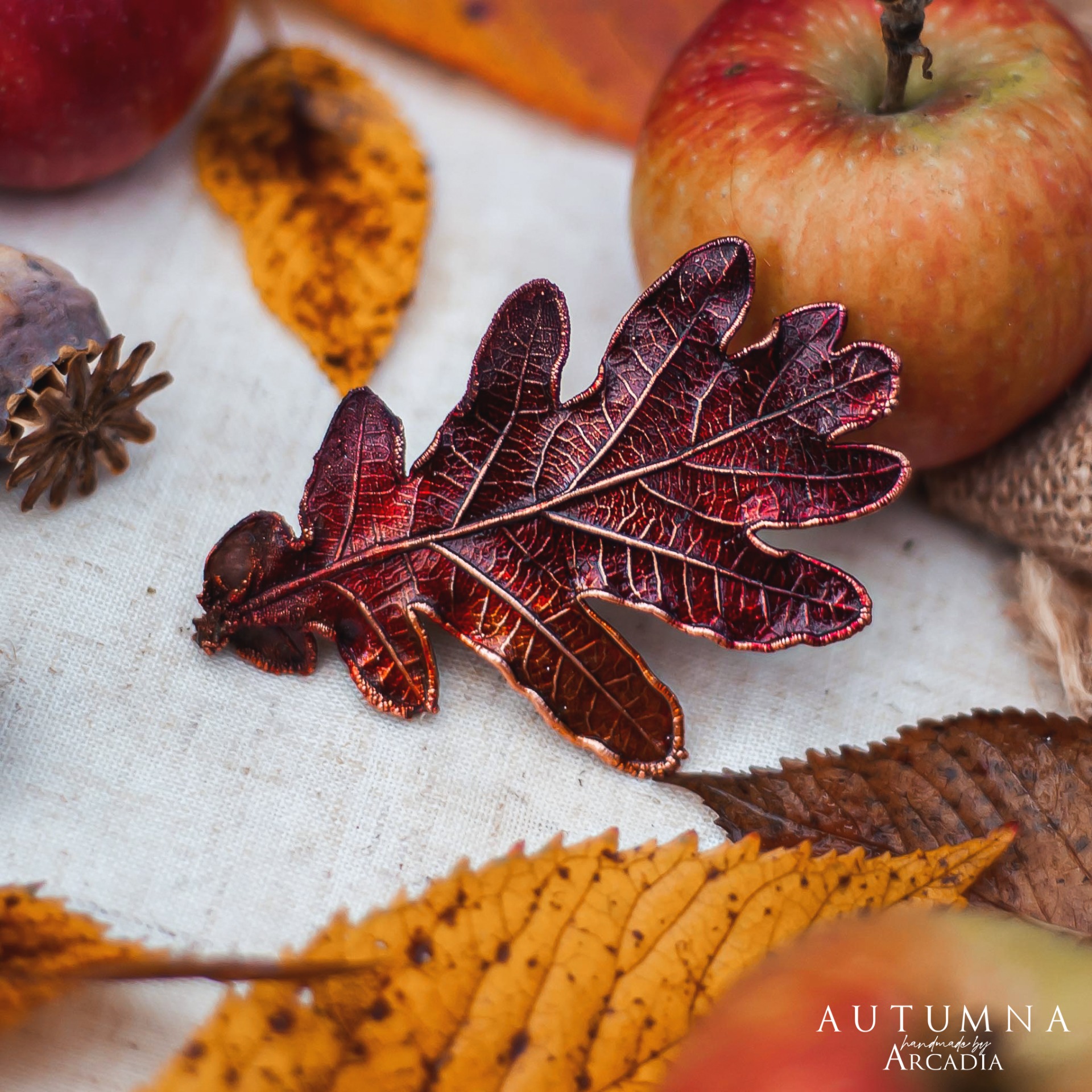 Spona do vlasů ze skutečného pokoveného dubového lístku v podzimních tónech rudé a zlatavé. Vyrobeno rukama a srdcem v alchymistické dílně na severu Čech.