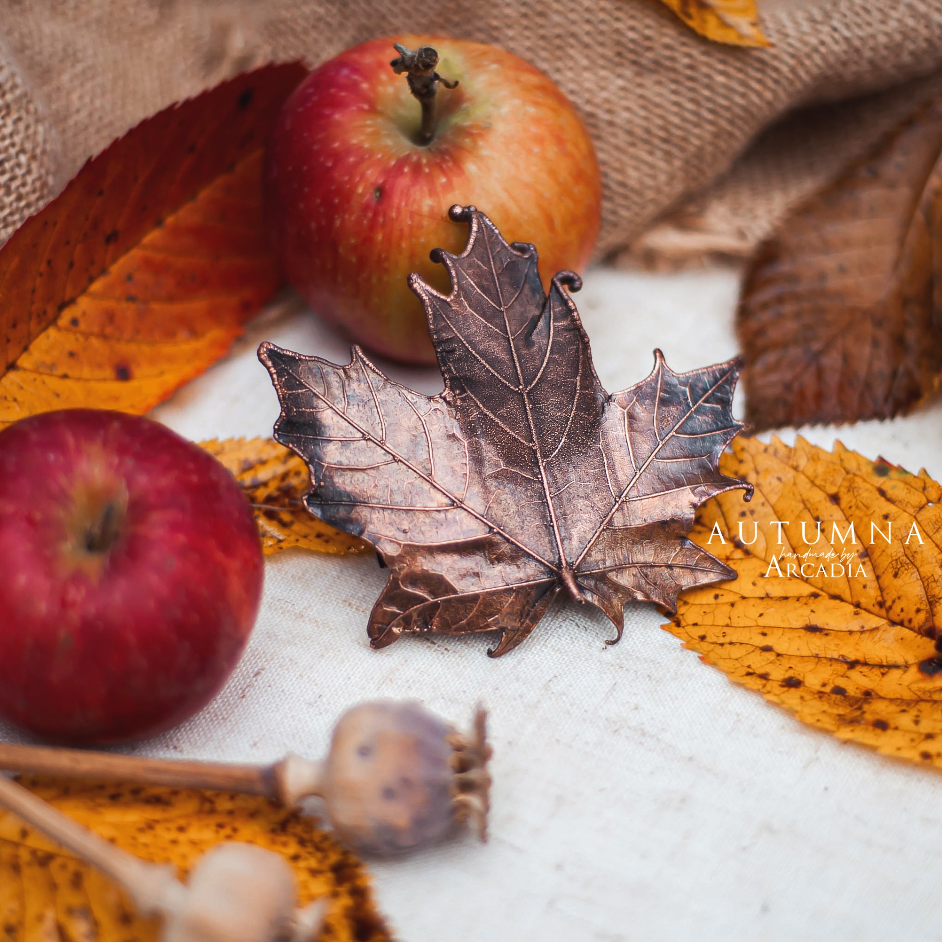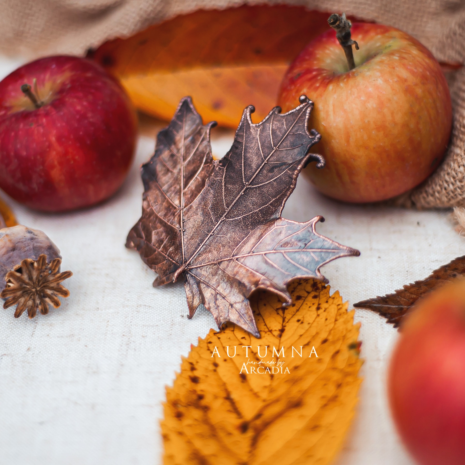 Spona do vlasů ze skutečného pokoveného lístku javoru v rustikální antické patině. Vyrobeno rukama a srdcem v alchymistické dílně na severu Čech.