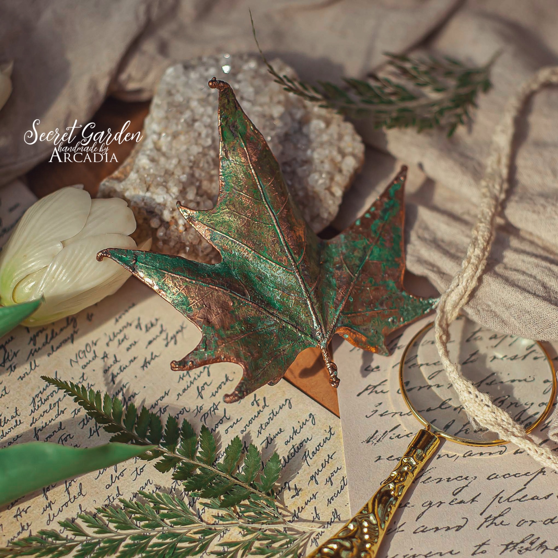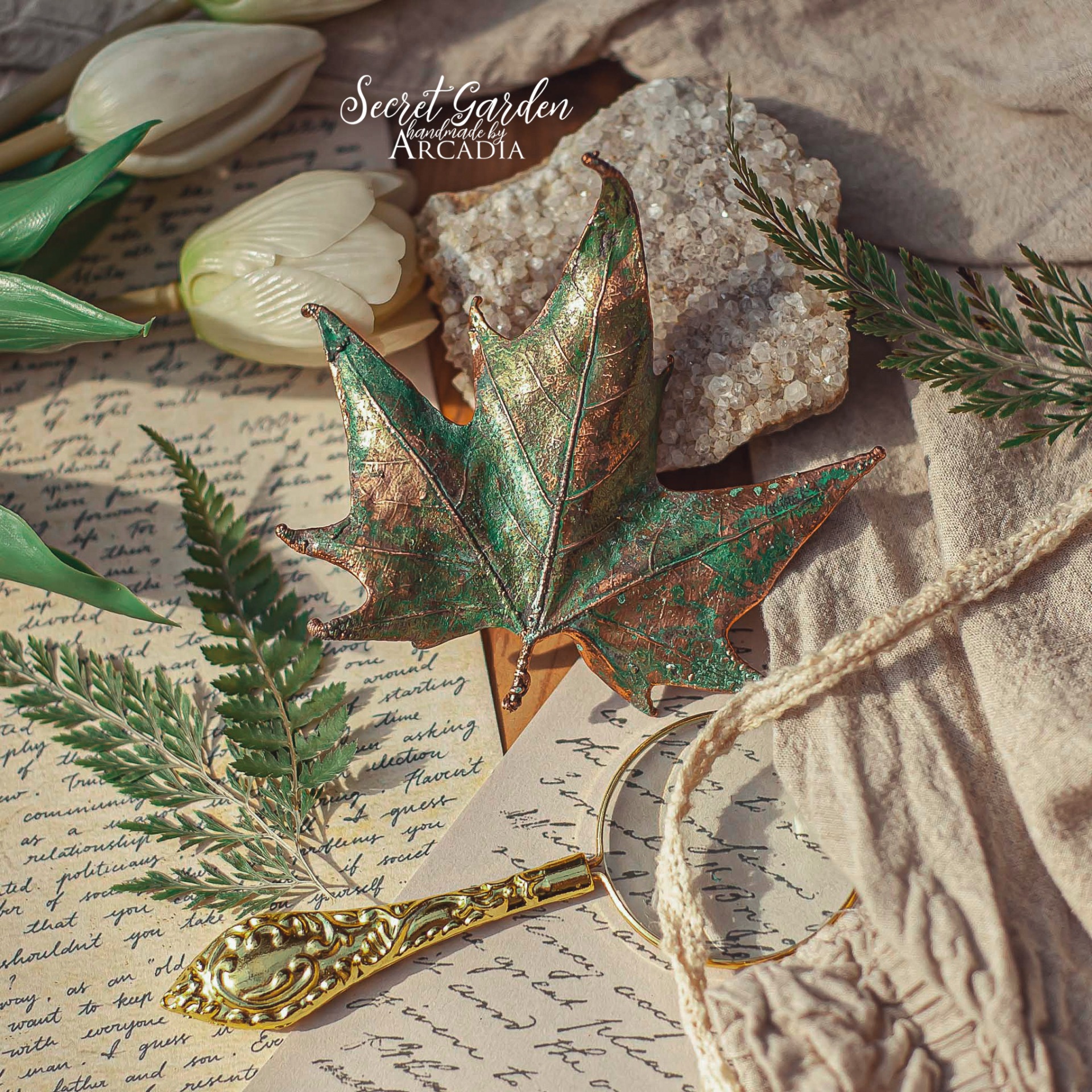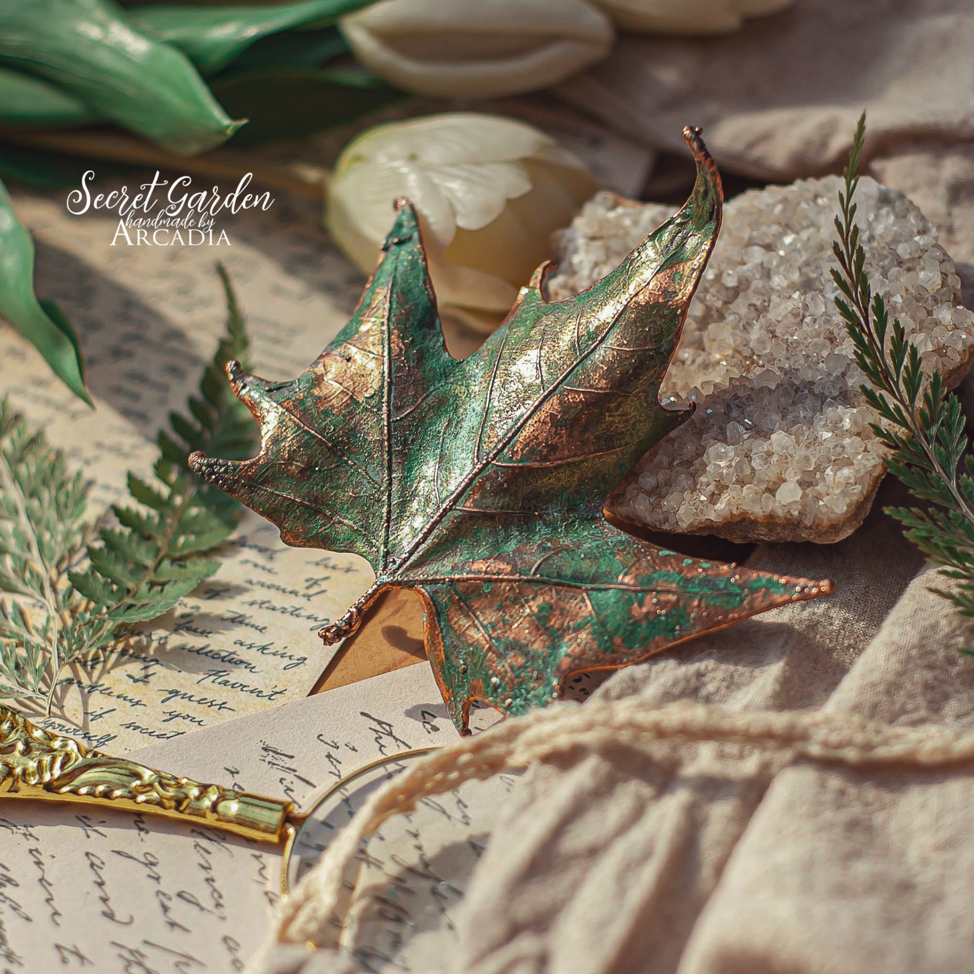 Spona do vlasů se skutečným pokoveným lístkem javoru v jemné vintage zelené. Sponový mechanismus 4,5 cm. Vyrobeno rukama a srdcem v alchymistické dílně na severu Čech.
